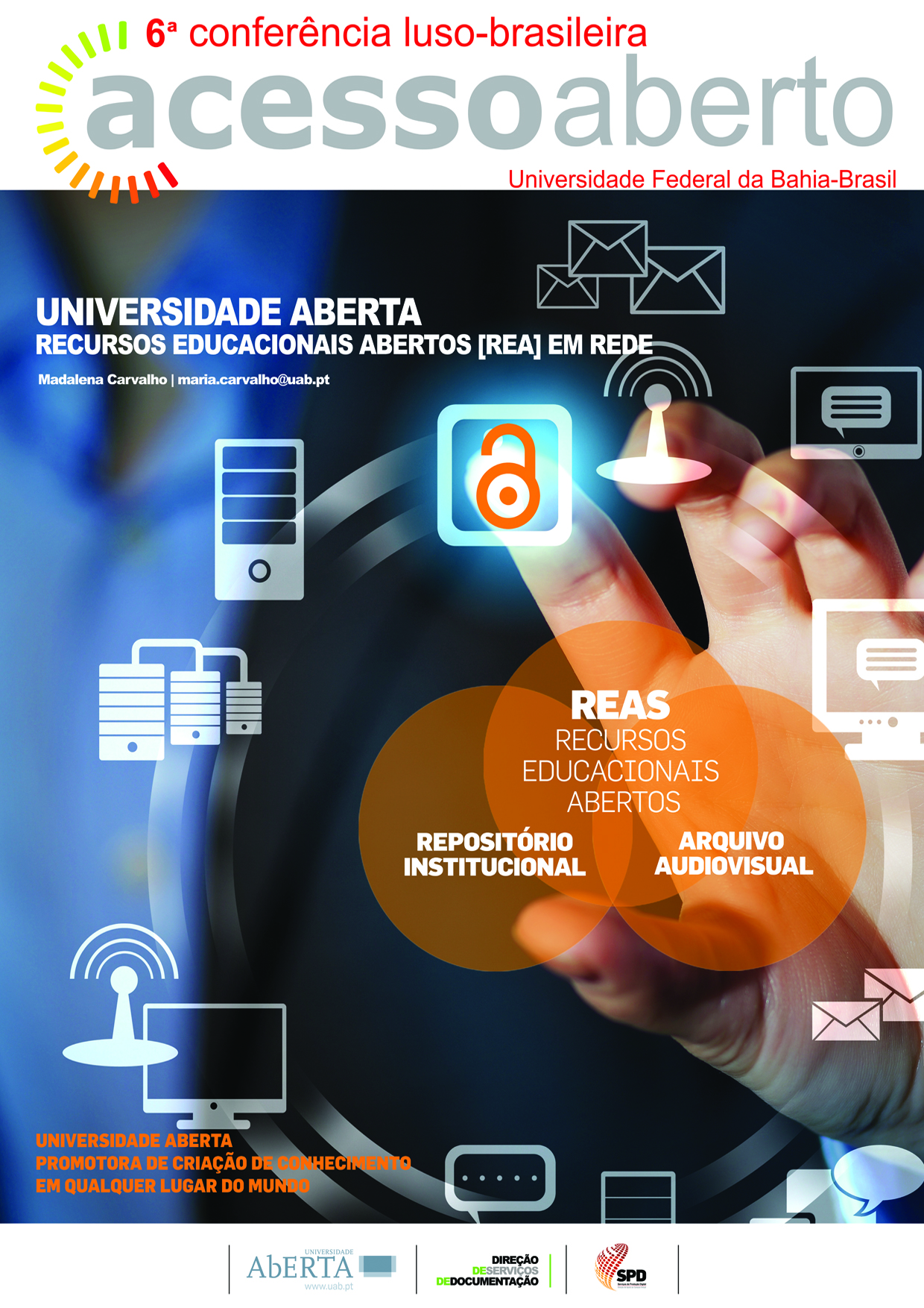 Carvalho, Madalena - Universidade Aberta: recursos educacionais abertos (REA) em rede. In Conferência Luso-Brasileira de Acesso Aberto, 6, Salvador, 2015. "Conferência..." [Em linha]. [S.l.] : [s.n.], 2015. 1 poster