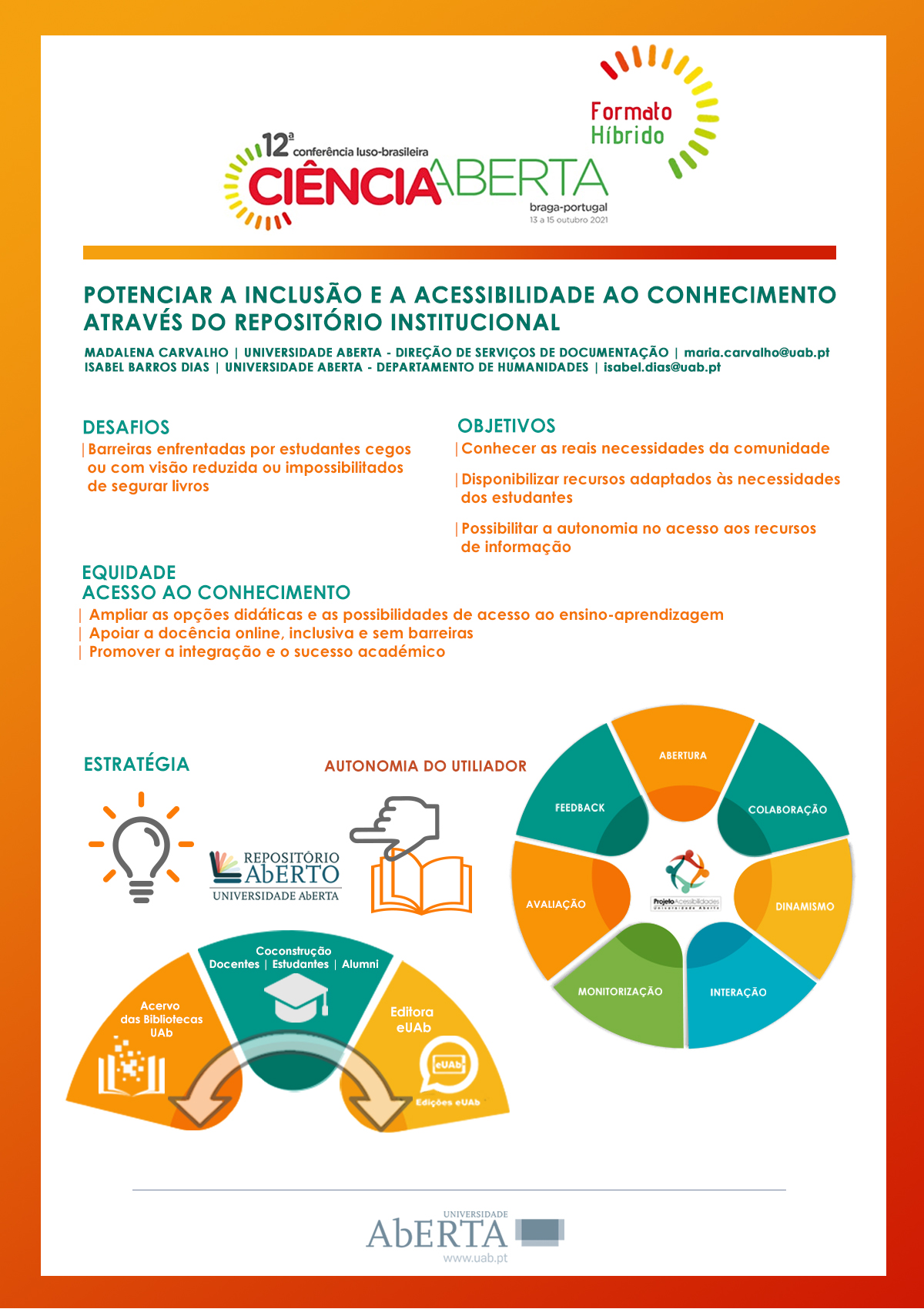 O trabalho incide sobre a identificação e implementação de estratégias e métodos para promover a acessibilidade de todos à informação e à educação inclusivas. Apresenta-se a solução implementada na Universidade Aberta de Portugal (UAb) para disponibilizar o acesso autónomo ao conhecimento produzido e disponibilizado pela Instituição aos estudantes com necessidades educativas especiais (NEE) ao nível da visão, ou físicas que dificultem ou impeçam o segurar de um livro, duas situações que obrigam ao recurso a leitores de ecrã. Esta solução resultou do trabalho desenvolvido de modo colaborativo entre o Projeto Acessibilidades, que tem por finalidade apoiar, em ambiente de e-learning, os estudantes da Universidade Aberta com NEE e a Direção de Serviços de Documentação, responsável pela disponibilização de serviços e recursos de informação e pela administração do Repositório Institucional. Analisa-se o processo de constituição, no Repositório Aberto, de uma comunidade com materiais de estudo e outros recursos de informação adaptados às necessidades destes estudantes. A disponibilização dos conteúdos e a promoção da autonomia dos utilizadores no acesso aos recursos, tem por finalidade ampliar as opções didáticas e as possibilidades de acesso ao ensino-aprendizagem e possibilitar o exercício de uma docência online inclusiva e sem barreiras.