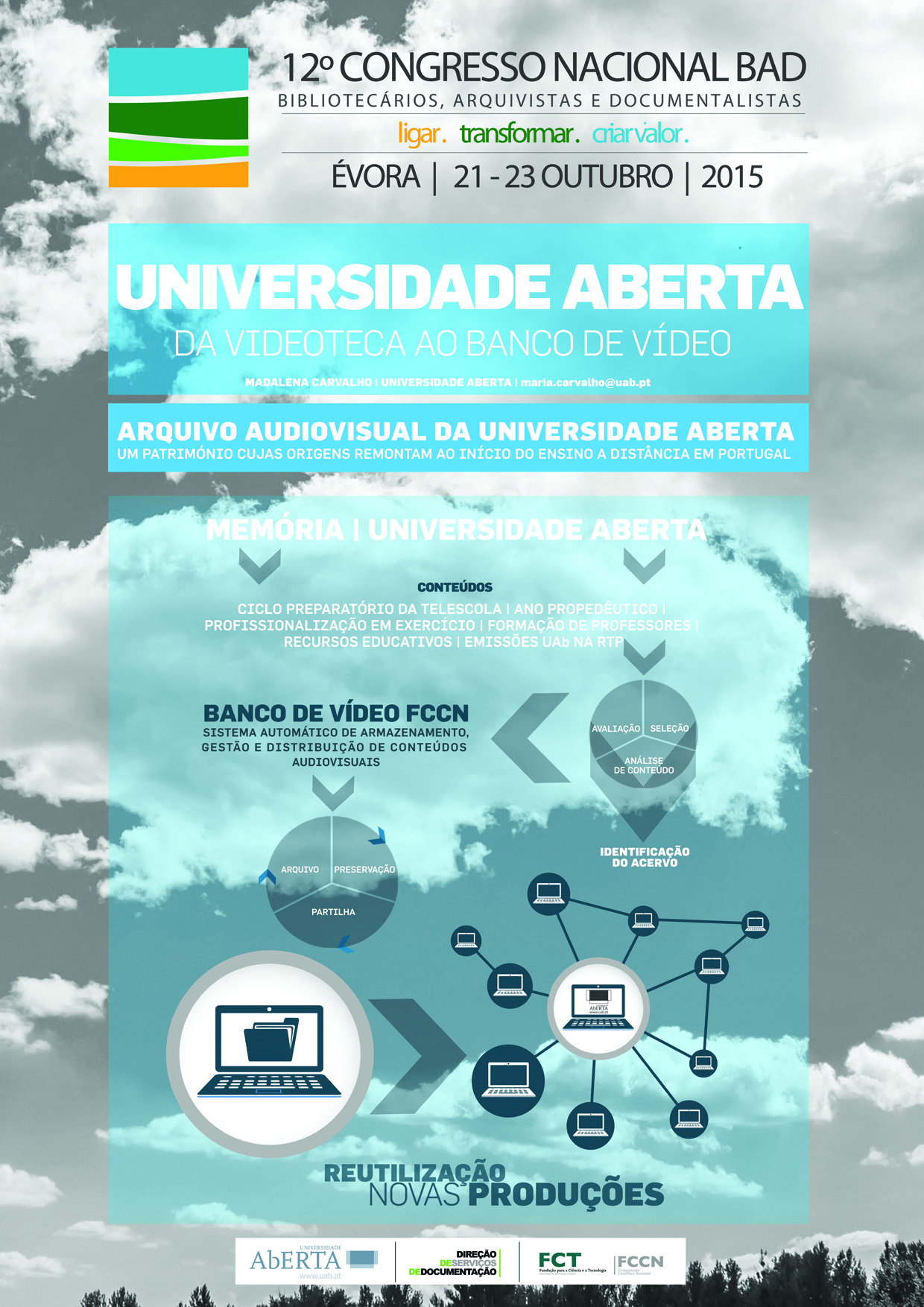 Carvalho, Madalena - Universidade Aberta: da Videoteca ao Banco de Vídeo. In Congresso Nacional BAD, 12, Évora, 2015. "Ligar [Em linha] : transformar : criar valor". [S.l.] : [s.n.], 2015. 1 poster