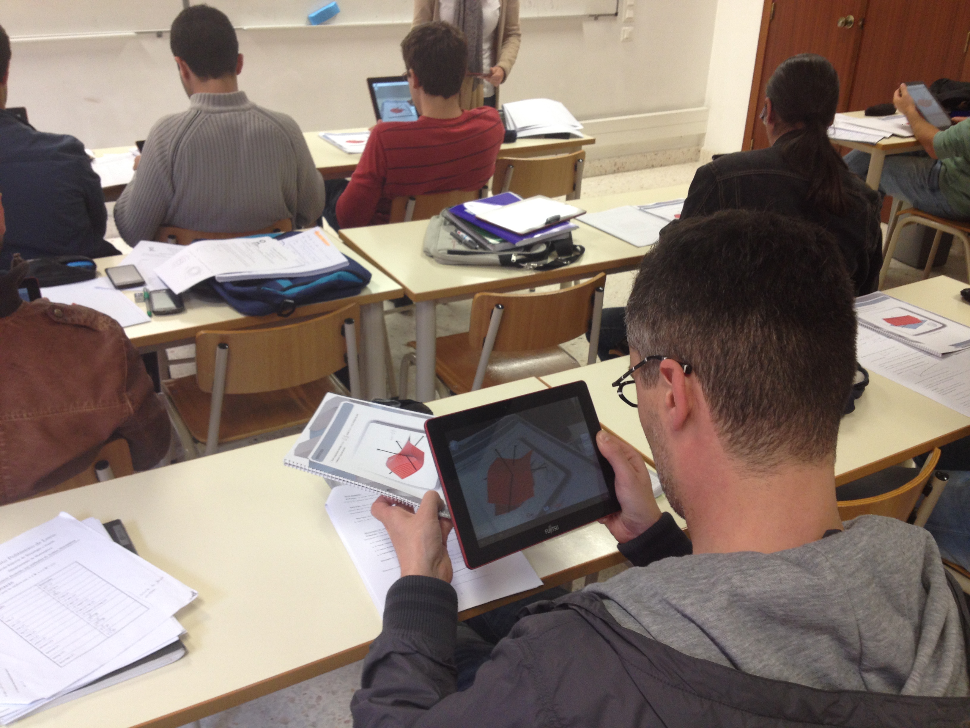 Registo fotográfico de uma implementação de conteúdos 3D, criados em realidade aumentada, numa aula de análise matemática, com estudantes de engenharia do Instituto Politécnico de Leiria. Recurso educacional produzido no âmbito de uma tese de doutoramento em educação, na especialidade de educação a distância e elearning. Projeto de investigação desenvolvido no LE@D, Laboratório de Educação a Distância e Elearning da Universidade Aberta, com o apoio do CDRsp, Center for Rapid and Sustainable Product Development - Centro para o Desenvolvimento Rápido e Sustentado do Produto do Instituto Politécnico de Leiria
