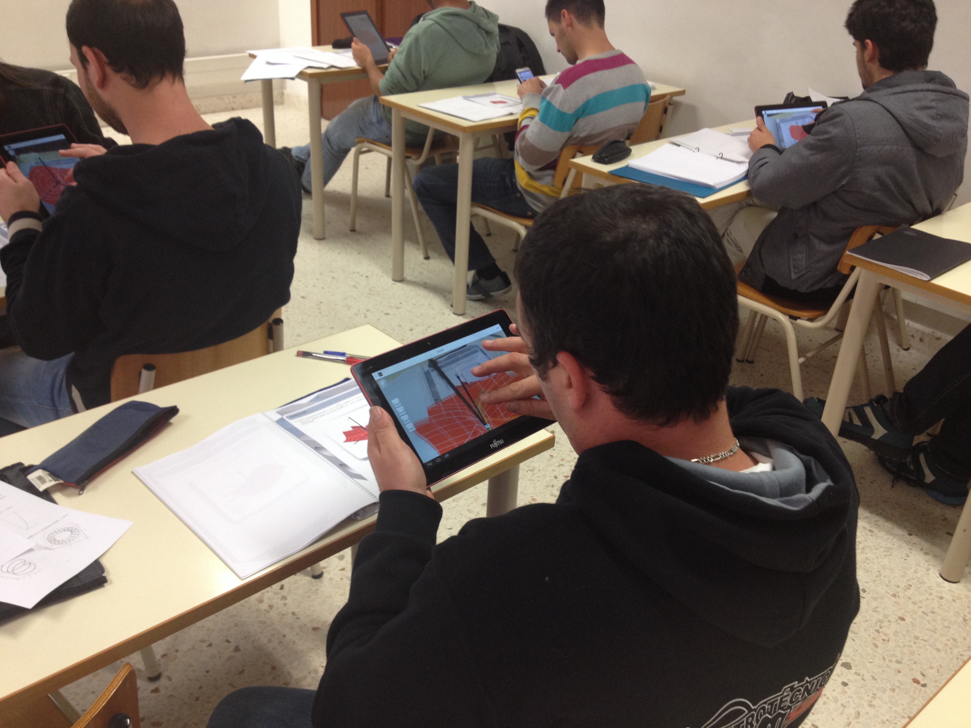 Registo fotográfico de uma implementação de conteúdos 3D, criados em realidade aumentada, numa aula de análise matemática, com estudantes de engenharia do Instituto Politécnico de Leiria. Recurso educacional produzido no âmbito de uma tese de doutoramento em educação, na especialidade de educação a distância e elearning. Projeto de investigação desenvolvido no LE@D, Laboratório de Educação a Distância e Elearning da Universidade Aberta, com o apoio do CDRsp, Center for Rapid and Sustainable Product Development - Centro para o Desenvolvimento Rápido e Sustentado do Produto do Instituto Politécnico de Leiria.
